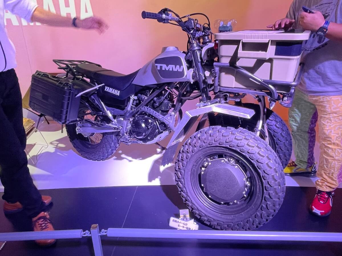 TMWは車輛実験部の有志で作ったというLMW(※トリシティの機構)初のオフロードバイク。前2輪の機構にすることで前にあるキャリア(箱を積載しているところ)が地面に対し常に水平を保つことができるというメリットが出るそうですよ。出品車両の中で走ってみたいナンバー1かもしれません